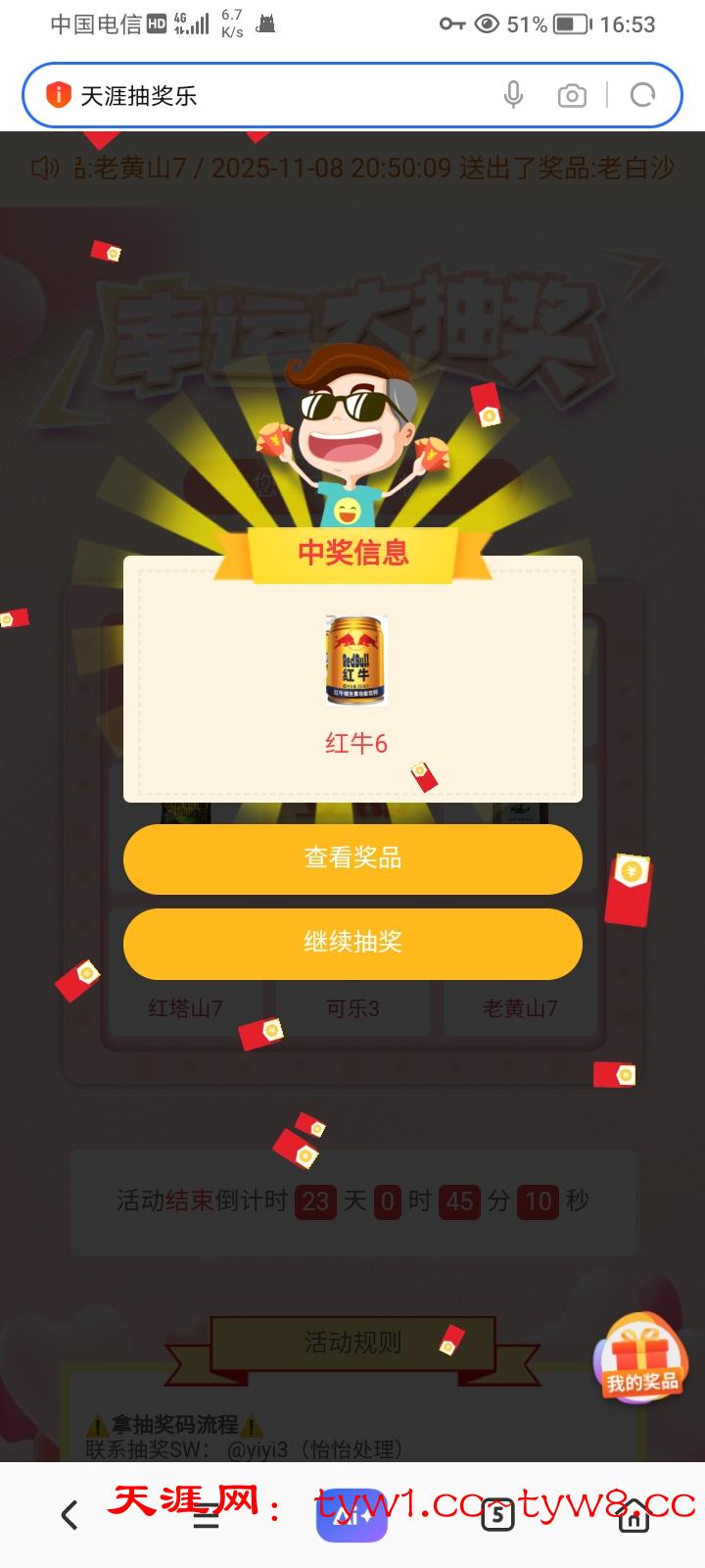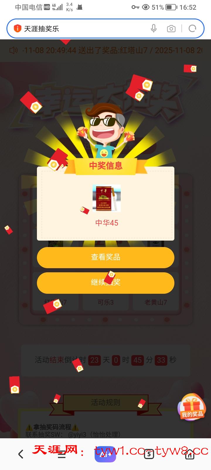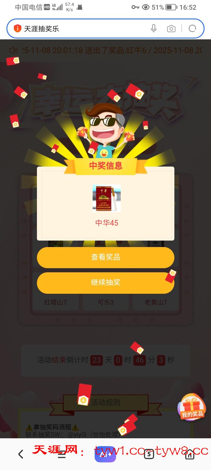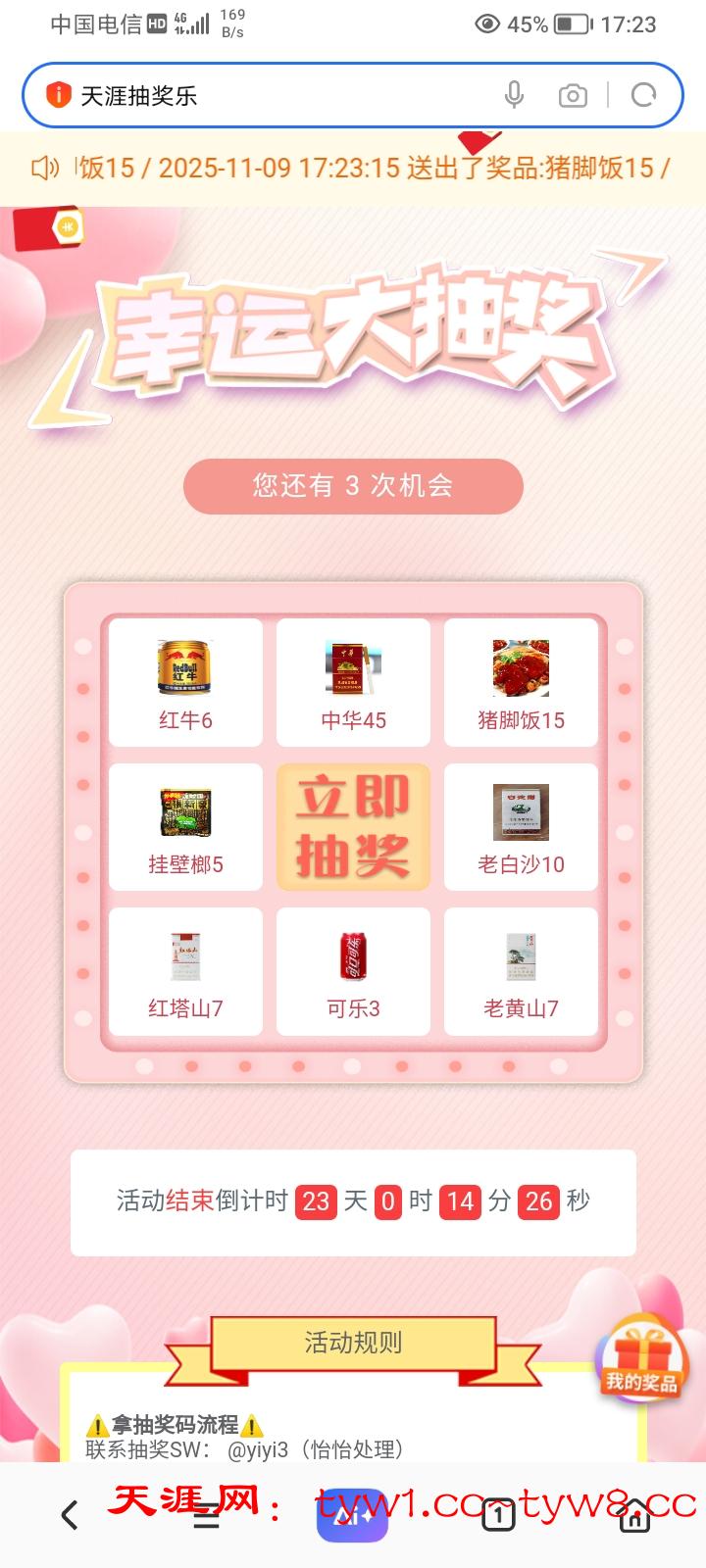 天涯转盘抽奖是百分百必中的,一天可以抽三次,我经常中猪脚饭,发财烟红牛之类的,今天参与抽奖抽了三次中了中华*2红牛*1真的太幸运了!感谢天涯,支持天涯,祝天涯越来越好进步有成!真心为老哥办活动的论坛!支持天涯!天涯牛逼!