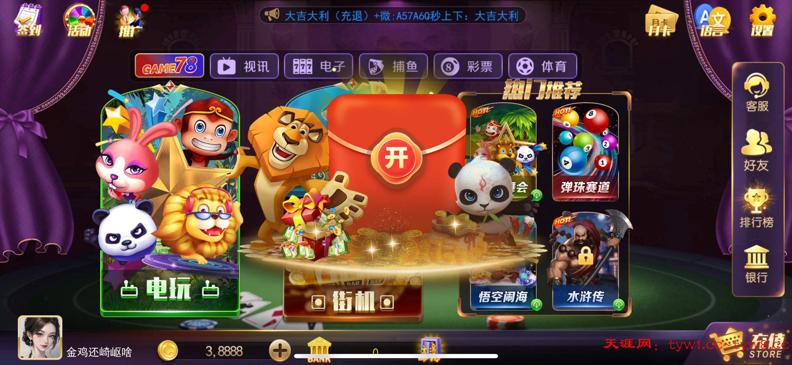 注册秒到38888金币,彩金不限制游戏。下分在排行榜处。有就有没有就无视!