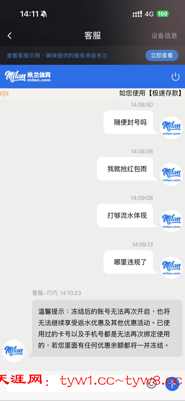 今天凌晨抢红包雨400,今天又充值100,去打百家乐,好路投注均注跟龙,第一次提现500,显示流水还差600多。流水打够后又提现500,账号冻结被黑。全程只有一次手滑庄闲各十块(本来10块跟龙庄,想再加10块,手滑点到闲上面了,好路投注里面的庄闲按钮挨得很近)。找代理、客服,说我是刷子,就这一个号,一个手机。
