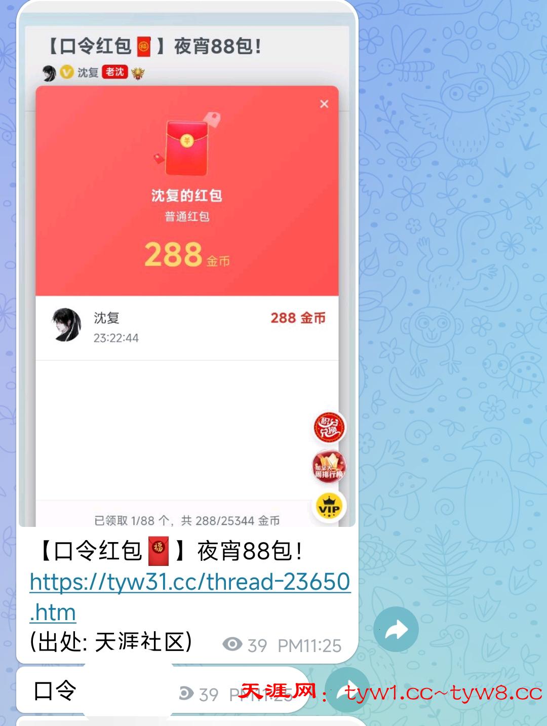 抢红包需要输入5个数字的口令,统一放在频道里面,大家进群拿即可 88 2.5万金币 论坛二级以上可抢,领到的记得反馈,祝各位盈利多多~